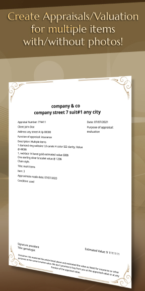 Create your appraisal or valuation PDF certificate in a matter of minutes, add up to 3 photos, you can Appraise/Valuate: Jewelry, Antiques, Arts, Fur, Carpets, Furniture, Crafts, and any valuable items! easy typing, you can also copy and paste description, fast efficient and affordable.